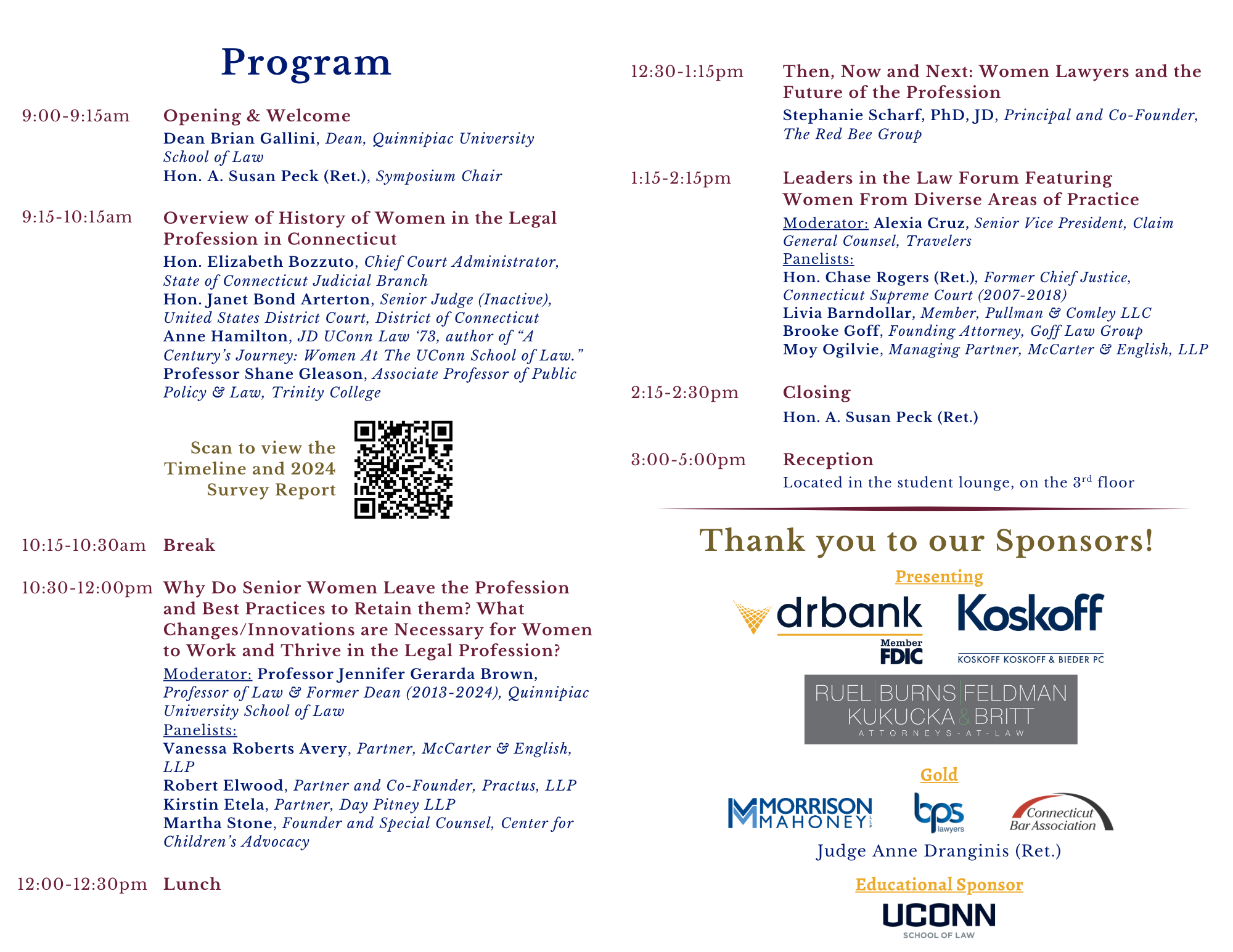 Join us for an hour-long panel discussing the history of women in the legal profession in Connecticut and where women attorneys stand today. Judge Elizabeth A. Bozzuto, Chief Court Administrator of the State of Connecticut, and Senior Judge Janet Bond Arterton, United States District Court (inactive), will speak on the status of women in the state and federal courts, respectively. Judge Bozzuto and Judge Arterton will be followed by Anne Hamilton, lawyer and journalist, who will present highlights from the Timeline of Connecticut Women in the Legal Profession created by Judge Susan Peck (Ret.) and Liz Drummond (former Assistant Director of the CBF), which is provided in the symposium materials. Attorney Hamilton will be followed by Professor Shane Gleason, Associate Professor of Law & Public Policy at Trinity College, who will discuss the results of a survey of Connecticut Bar Association members conducted in 2024, and compare the results with those of a similar survey conducted in 1993-1995. As the number of women entering law school and the legal profession continues to exceed the number of men, we will assess what this may mean for the future of the legal profession.